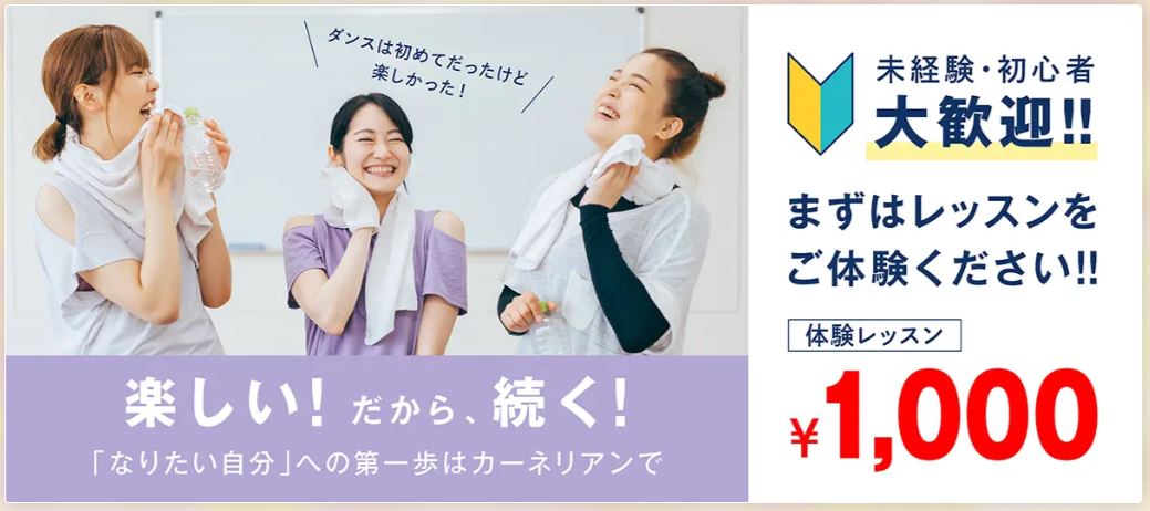 「カーネリアン」は渋谷、高田馬場、新宿、代々木に教室があるダンス教室です。こちらも初心者向けに特化しており満足度が94%と高いのが特徴。